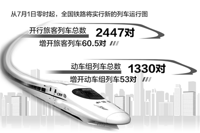 本报北京6月11日讯 记者齐慧从中国铁路总公司获悉:从7月1日零时起,全国铁路将实行新的列车运行图。全国铁路增开旅客列车60.5对,其中增开动车组列车53对。运行图调整后,全国铁路开行旅客列车总数达到2447对,其中动车组列车1330对。