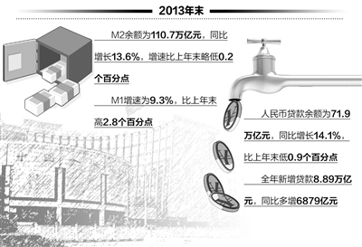 《年报》对今年的M2增速进行了预测:2014年,广义货币供应量M2预期增长13%左右。《年报》指出,把货币政策调控与深化改革紧密结合起来,进一步完善调控模式,疏通传导机制,提高金融运行效率和服务实体经济的能力。综合运用数量、价格等多种货币政策工具组合,健全宏观审慎政策框架,保持适度流动性,引导货币信贷和社会融资规模合理增长。