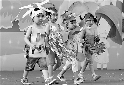 6月12日,北京市朝阳区王四营幼儿园的小朋友在展示环保服饰。孩子们身着利用废旧物品组合起来的“时装”,宣传节约资源从身边做起。