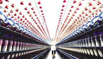 在山东夏津县仁和纺织科技有限公司,工人在细纱车间忙碌(6月12日摄)。山东省夏津县加快调整产品结构,实施产业升级,鼓励纺织企业淘汰落后织造产能,改造更新设备。目前该县90%以上的纺织企业实现了纺织新工艺的转变。 新华社记者 郭绪雷摄
