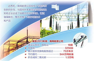 截至2013年底,南网能源公司共建设运营充、换电站18座,充电桩3256台,累计提供充换电服务超过75万车次,节约替代944万吨标油,折合减排二氧化碳1.5万吨。
