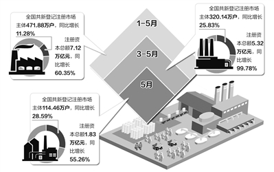 “一是全国新登记注册市场主体持续快速增长。”国家工商总局副局长刘玉亭说。3至5月,全国共新登记注册市场主体320.14万户,同比增长25.83%,注册资本(金)总额5.32万亿元,同比增长99.78%。其中,5月新登记注册市场主体114.46万户,同比增长28.59%,注册资本(金)总额1.83万亿元,同比增长55.26%。
