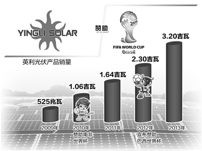 品牌知名度的提升,带动了英利产品全球销量的攀升,为企业带来了效益。2009年英利光伏产品销量是525兆瓦,2010年赞助南非世界杯,销量升至1.06吉瓦,2011年就达到1.64吉瓦,增长50%。在全球光伏行业处于低潮期时,2012年英利仍宣布赞助巴西世界杯,当年完成销量2.3吉瓦,2013年又完成3.2吉瓦。梁田说,“赞助世界杯之前英利产品只进入9个国家,而现在已进入50个国家。”