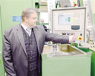立陶宛铸造的首批欧元硬币日前问世。图为立陶宛央行行长瓦西里奥斯卡斯在首批欧元硬币铸造仪式上按动电钮。 新华社发