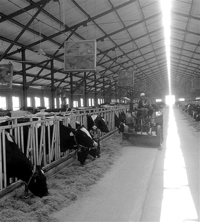 在位于沈阳法库的辽宁辉山乳业八家子牧场,记者一走进厂区,就看见左前方的露天牛舍里几十头奶牛正在悠然自得地享受着午前的阳光。在旁边长186米、宽28米的室内牛舍里,500头奶牛正在走道两边规划整齐的饲养栏内自在地休憩。