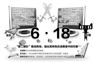 “从此次‘6·18’的促销方式可以看出,天猫直指京东,其玩法就是冲击京东重点自营品类的销售,直捣老巢。”市场研究机构易观商业解决方案副总裁田峥告诉《经济日报》记者。