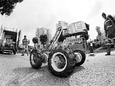 6月20日,在福建省泉州市刺桐路,机器人在工作人员的操控下移动。福建省泉州市目前已全面进入汛期,为防止发生内涝,泉州市有关部门使用带有视频系统的机器人检测地下排水管网,显著提高了工作效率。