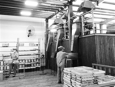 穿上白大褂、带上防尘帽、套上蓝鞋套、冲洗过双手、关进风淋室,经过一整套“程序”,记者才得以进入茯茶龙头企业陕西怡泽茯茶有限公司的生产车间。“我们是用生产食品的标准来生产泾盛裕茯茶的。”企业董事长马恒光解释说。在窗明几净的车间里,不仅有现代化的实验室、检验室、筛选车间、烘焙室,还保留了古老的手工制茶工艺,如筑胚成封环节。工人们先把封袋衬在坯模内,打开封袋口,把炒好的茶灌入、筑夯,筑好后封口,退模后一次成封。整个过程一气呵成。当封好的茶经过蒸汽灌注时,茶香四溢。茯茶要经过120摄氏度汽蒸、40吨压制、25个日夜恒温恒湿发酵,才能收获古新交融的清香。