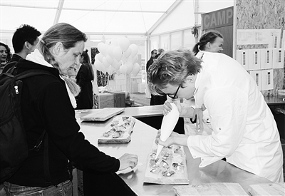 6月21日,在丹麦首都哥本哈根,来自哥本哈根大学的志愿者在为观众制作鱼皮小吃。2014年度欧洲科学开放论坛21日在丹麦首都哥本哈根拉开帷幕,来自75个国家的4500多名与会者齐聚一堂,探讨全球科研和创新的发展方向。 新华社发