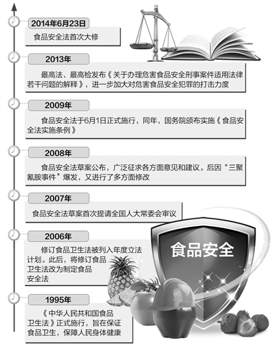 6月23日,食品安全法修订草案提请十二届全国人大常委会第九次会议审议,拟用“重典”守护老百姓“舌尖上的安全”。“中国食品企业违法生产经营现象依然存在,食品安全事件时有发生,监管体制、手段和制度等尚不能完全适应食品安全需要,法律责任偏轻、重典治乱威慑作用没有得到充分发挥,食品安全形势依然严峻。”国家食品药品监督管理总局局长张勇向全国人大常委会作草案说明时明确表示。