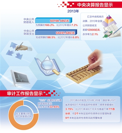 6月24日,财政部部长楼继伟和审计署审计长刘家义,分别向十二届全国人大常委会第九次会议作2013年中央决算报告和审计工作报告。决算是对年度财政预算执行最终情况的全面反映,加强对决算的审查和监督、确保政府的每一分钱都花得明白,是新一届政府的工作要求和承诺。两个报告对政府账本仔细梳理,逐项分析,查找问题隐患,并积极寻找解决路径——