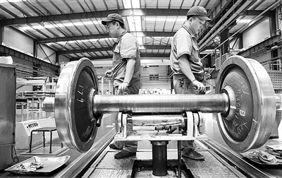 太原铁路局湖东车辆段是大秦铁路惟一的货车车辆段,担负着多条干支线的货车检修任务。近年来该车辆段成立科技专家团队,实施专项科技管理,先后研发出一批应用科技成果。图为工作人员在湖东车辆段轮轴车间操作。 本报记者 赵 晶摄