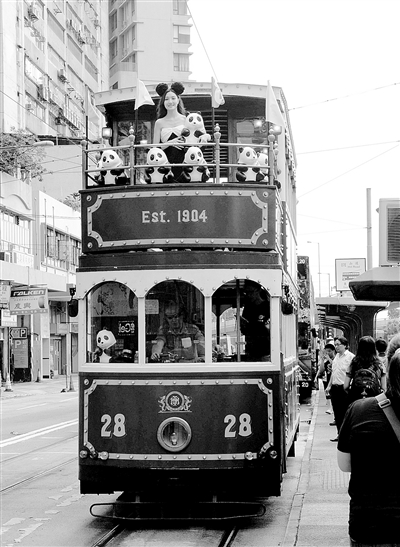 图为乘坐电车的纸糊大熊猫经过香港岛西环居民区。近日,由法国艺术家保罗创作的1600只纸糊大熊猫乘坐电车巡游香港岛。