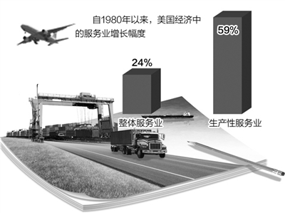过去数十年来,生产性服务业在美国经济中占据的份额逐渐增大,一直贯穿于制造业的价值链中。2011年,美国制造业25.3%的中间产品出自服务业。对某些制造行业,如计算机和电子产品,衡量服务程度的比值高达47.6%。2012年,美国制造企业三分之一的员工从事的是服务性工作,而且这一比例不断上升。