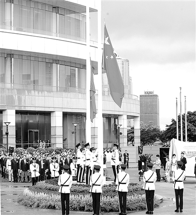 7月1日清晨,骤雨初歇。香港金紫荆广场上,特区政府举行隆重的升旗仪式,庆祝香港回归祖国17周年。中央人民政府驻香港特区联络办公室主任张晓明表达了对香港的祝愿:“祝福香港和祖国的明天一样更加美好,也希望香港政改的前景,像这个天气一样,经历风雨之后,还能见到彩虹。”