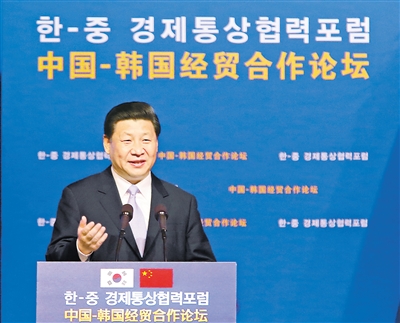 本报首尔7月4日电 记者顾金俊 杨明报道:国家主席习近平4日在首尔与韩国总统朴槿惠共同出席中韩经贸合作论坛。习近平发表题为《携手合作,共创未来》的重要讲话,指出两国经贸合作具有天时、地利、人和,中韩各自发展必将为两国企业家提供更广阔的合作空间,希望双方抓住机遇,不断提高中韩经贸合作水平。