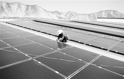 甘肃兰州的西北永新化工园区“屋顶光伏电站”日前并网发电,这个“屋顶光伏电站”共安装7800块非晶硅薄膜太阳能电池、780块多晶硅,总装机规模达到1.1兆瓦。图为工人在屋顶光伏电站安装避雷装置。 新华社记者 聂建江摄