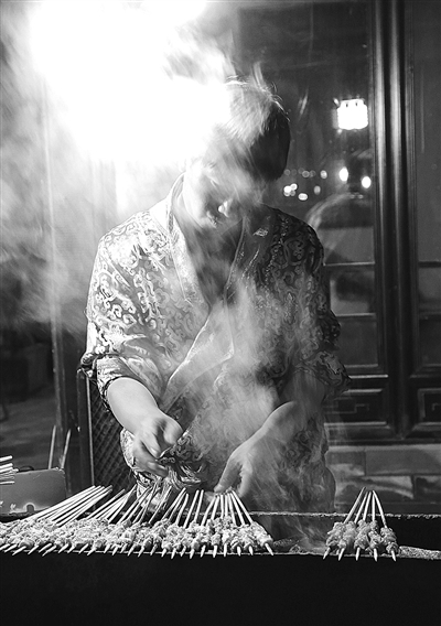 在河北滦州古城,烤羊肉串的小摊连成一片,摊主们把自己家的音响音量调到最大,伴着动感的节奏,跳着舞步,翻串、撒孜然,时不时来几个旋转,再发出一声呼啸!那架势,简直是行为艺术家。