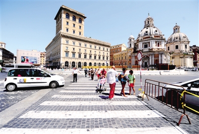 上图为在意大利罗马帝国大道步行区域的一端,警察引导出租车通过关卡进入该街道。帝国大道自从被规划为步行路段后,只允许警车、救护车、出租车等特殊车辆通行。