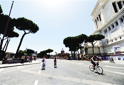 下图为自行车爱好者在意大利罗马帝国大道骑行。 新华社发
