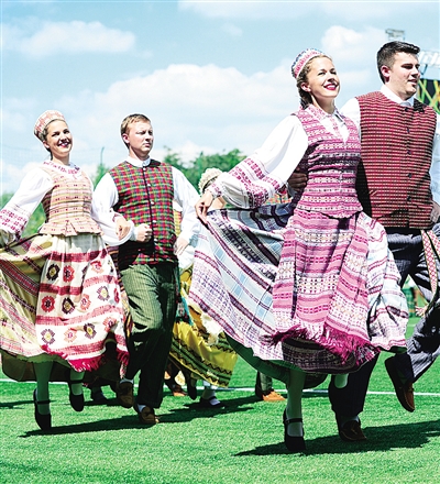 立陶宛2014歌曲节于7月2日至6日在立陶宛首都维尔纽斯举行。图为在立陶宛维尔纽斯,人们在歌曲节的舞蹈日活动中表演。