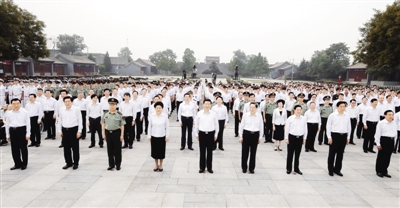 上午10时,纪念仪式开始。中国人民解放军军乐团奏响《义勇军进行曲》。习近平等党和国家领导人同现场1000多名各界代表齐声高唱中华人民共和国国歌。“冒着敌人的炮火,前进,前进,前进进!”雄壮的歌声在广场上空回响。