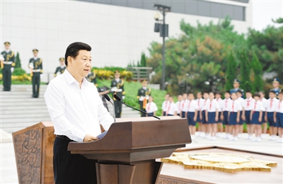 今天,我们在这里为独立自由勋章雕塑揭幕,就是要缅怀在争取民族独立和自由过程中英勇献身的烈士们,就是要缅怀为追求和平正义作出重要贡献的人们,告慰在那场战争中不幸遇难的同胞们。我们永远缅怀他们、铭记他们。
