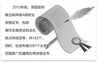 近年来,英国政府对职业教育进行大刀阔斧的改革,完善现代职业教育体系,以适应当前国家经济发展的需要。去年底,英国政府推出新种类A级职业资格证书,包括摩托车维修证和法式糕点烘焙证等,共142个。英国政府希望这项举措能够切实提升年轻求职者的竞争力,为其争取工作机会添油加力。同时,英国政府还宣布推行87个业务范围更广的通用应用资格证书,作为职业教育改革的一部分。专家指出,高质量和高性价比的资格证书是所有优秀职业教育系统的核心,这项改革使英国在建立有效的职业教育机制上迈出了坚实的一步。