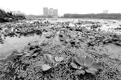连日来,汉江武汉段江面出现大量水葫芦,形成一条绵延数十公里的“绿带”。新华社记者 程 敏摄