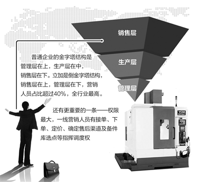 “我们的转型是彻底掉个儿!”立加产品经理张东概括说。普通企业的金字塔结构是管理层在上,生产层在中,销售层在下。立加是倒金字塔结构,销售层在上,管理层在下,营销人员占比超过40%,全行业最高。还有更重要的一条——权限最大,一线营销人员有接单、下单、定价、确定售后渠道及备件库选点等指挥调度权。经理干啥去了?经理就在一线。在战场上让看得见“敌情”的人呼唤“炮火”,这是立加转型的理论依据。