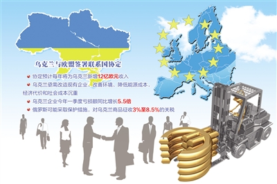 乌克兰与欧盟签署的联系国协定除序言外共有7大部分,另外还有43个附件,3个议定书。该协定经济部分规定,乌克兰将与欧盟实现深入的经济一体化,建立全面自由贸易区。对于乌克兰而言,这意味着其未来将与欧盟全面接轨,可以更加便利地获得来自欧盟的贷款和投资,按照欧盟标准生产的乌克兰产品将打开更广阔的市场。预计乌克兰对欧盟年出口将增长10亿欧元,其中服装、食品和有色金属出口行业将特别受益。除了贸易优惠,乌克兰还将继续享受欧盟的财政援助,联系国协定的实施每年将为其新增12亿欧元收入。