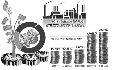 “据分析测算,2013年信托业总资产规模的78.27%投向了实体经济领域,在舒缓宏观经济的周期性波动上发挥了重要作用。”中国信托业协会专职副会长王丽娟表示,从2010年到2013连续4年,资金信托投向工商企业的比例逐年上升,分别为18.56%、20.41%、26.65%和28.14%。