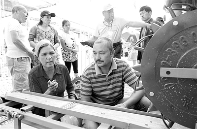 7月9日,2014年中哈霍尔果斯国际边境合作中心机电产品博览会开幕,本次展会共有50余家知名机电企业参展。图为一家企业的新型播种机受到客商的关注。 本报记者 李树贵摄