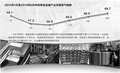 2014年6月,中经有色金属产业景气指数为49.7,较上月回升0.8点,上升到“偏冷”区间上界,有色金属行业运行继续保持回稳势头。
