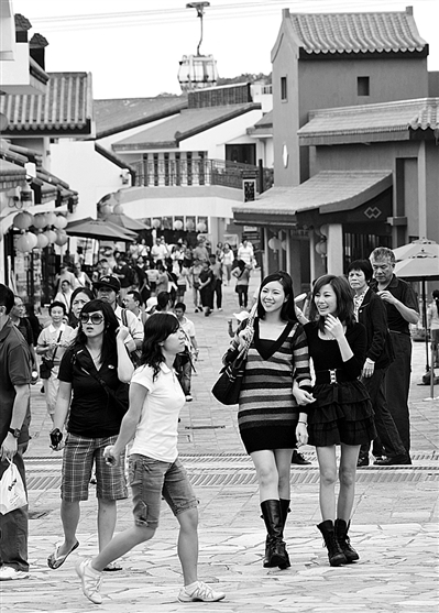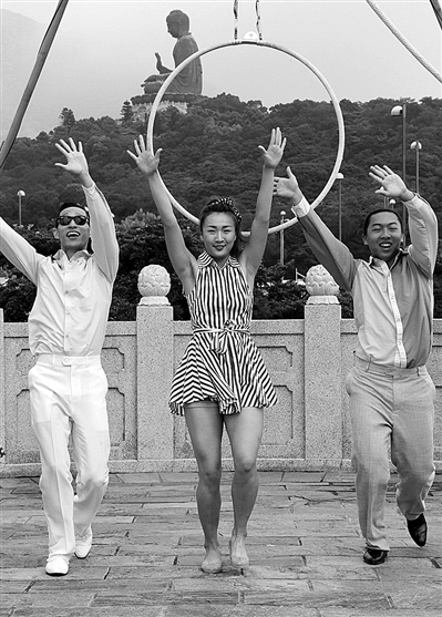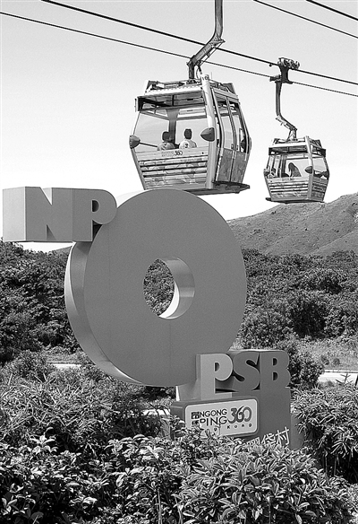 昂坪是香港著名的旅游景点,游客在这里领略自然风光的同时,还能享受香港美食、参与互动游戏。左图为游客在昂坪美食荟萃地膳坊街上。中图是被誉为“世界十大惊喜缆车之旅”之一的昂坪360缆车。右图为游客参与“舞吧﹗香港电影”主题活动。 本报记者 陈 颐摄