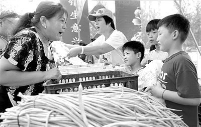 7月19日,北京五棵松大集蔬菜义卖点,“太阳村”的孩子正在销售他们自己采摘的有机蔬菜。当日,北京太阳村绿色蔬菜义卖点正式开张。