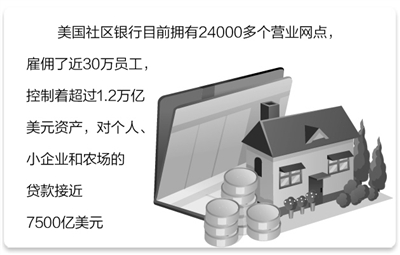 美国独立社区银行协会公布的数据显示,美国社区银行目前拥有24000多个营业网点,雇佣了近30万员工,控制着超过1.2万亿美元资产、1万亿美元的储蓄,对个人、小企业和农场的贷款接近7500亿美元。据美国联邦储蓄保险公司统计,将近60%的规模在100万美元以下的小企业依靠这些家门口的银行提供贷款等金融服务。