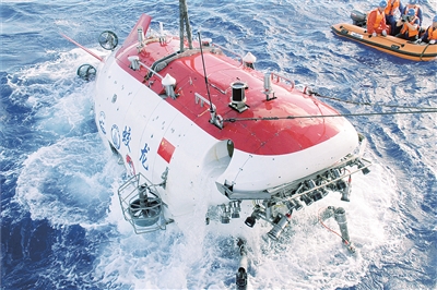 7月21日,“蛟龙”出水。“蛟龙”号载人潜水器21日在西北太平洋采薇海山区开展2014年试验性应用航次第4次下潜作业,最大下潜深度2414米,水中作业时间9小时43分。取得结壳和岩石7块、沉积物样2管、近底层水样8升、生物样品7个,其中海绵2个、珊瑚3个、海参1个、海胆1个。 新华社记者 罗 沙摄