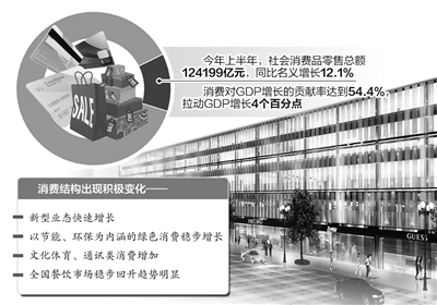 今年以来,我国持续出台了一系列拉动内需的政策措施,将稳增长、调结构等多个目标相结合,取得明显成效。上半年,社会消费品零售总额124199亿元,同比名义增长12.1%,增速比一季度加快0.1个百分点。同期消费对GDP增长的贡献率达到54.4%,拉动GDP增长4个百分点。“三驾马车”中,消费成为对经济提升贡献最大的第一动力。