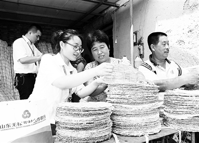 7月21日,山东省无棣县农村合作银行工作人员来到该县信阳镇吴店村,向村民田芳(右二)了解苇帘加工产业发展情况。无棣县位于渤海湾畔,拥有20万亩芦苇湿地,苇帘加工有着悠久的历史。在当地农合行的大力支持下,该县苇帘加工产业已覆盖水湾、信阳、柳堡等5个乡镇,从业人员5万余人,依托苇帘加工产业,农民在家门口就实现了就业。 蒋惠庆摄