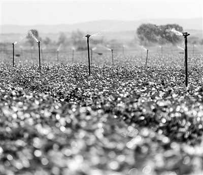 宁夏大力发展高效节水灌溉技术,截至目前,高效节水灌溉面积达165万亩。图为固原市原州区马铃薯繁育基地,小型喷灌节水设备在进行喷灌作业。