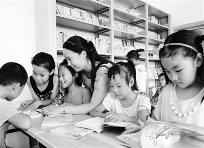 上图 河北省滦平县火斗山村农家书屋,中学生苏新月(右三)正在辅导小学生读书。