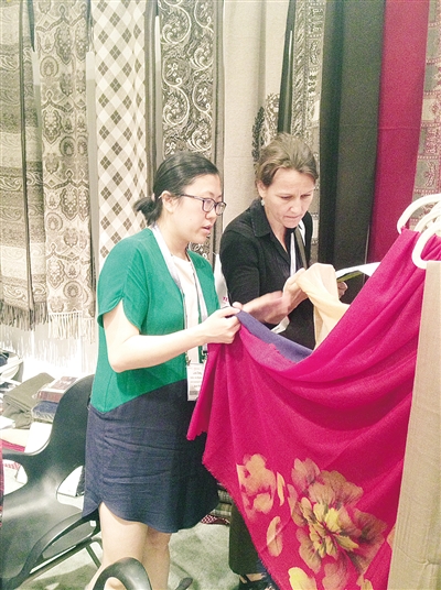 左图 第十五届“中国纺织品服装贸易展览会(纽约)”暨纽约国际家纺采购展、纽约国际服装采购展、美国TEXWORLD USA服装面料展于22日至24日在纽约贾维茨会展中心盛大开幕。许多中国企业带着最新产品前来纽约与客户洽谈业务。图为当地客商正在详细了解中国呼和浩特市坤华宁远纺织品有限公司的最新产品。 本报驻纽约记者 张 伟摄