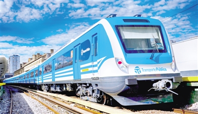 下图 中国出口量最大的城际动车组首批车辆7月21日在阿根廷投入运营。这批动车组由南车四方研制,首批投入运营的动车组共6列、54辆,在阿根廷布宜诺斯艾利斯的萨缅托线运行。阿根廷的萨缅托线全长约38公里,主要服务于布宜诺斯艾利斯市中心至卫星城市的10个区域。图为投入使用的城际动车组。 新华社发