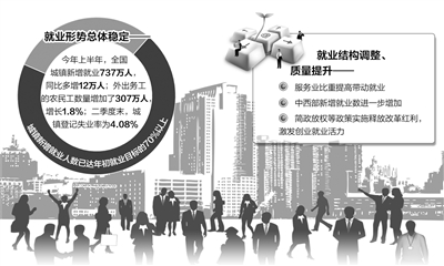 今年年初,对于就业形势,不少地方政府确有担心。按照一般规律,经济增速下滑至7.5%左右,可能会对就业造成影响。然而,前6个月城镇新增就业保持了稳步增长。1至6月,全国城镇新增就业737万人,同比多增12万人,已经达到年初1000万人就业目标的70%以上;二季度末,城镇登记失业率为4.08%,继续保持在较低水平。从农业劳动力转移就业来看,国家统计局的数据表明,今年上半年,外出务工的农民工数量增加了307万人,增长1.8%。就业数据好于预期。