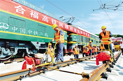7月28日,建设者在合福高铁福建武夷山境内铺设最后一对钢轨。当日,合福高铁(合肥—福州)闽赣段铺轨贯通。合福高铁是京福(北京—福州)快速铁路通道的重要组成部分,计划于2015年5月开始运行试验。 新华社记者 张国俊摄