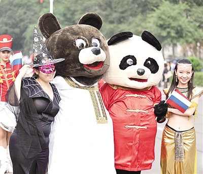 7月28日,“中俄文化大集”的吉祥物携手巡游狂欢。当日,中俄边城黑龙江省黑河市举行中俄民众巡游狂欢活动,两国民众载歌载舞在街道上巡游狂欢,迎庆第五届“中俄文化大集”。