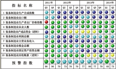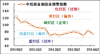 二季度,中经装备制造业预警指数为73.3,比上季度回落10.0点,由正常稳定的“绿灯区”降至偏冷的“浅蓝灯区”。