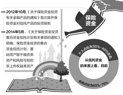 今年5月,中国保监会下发《关于保险资金投资集合资金信托计划有关事项的通知》明确提出,保险资金投资的集合资金信托计划,基础资产限于融资类资产和风险可控的非上市权益类资产。其中,固定收益类的集合资金信托计划,其信用等级不得低于国内信用评级机构评定的A级或者相当于A级的信用级别。不得投资单一信托,不得投资基础资产属于国家明令禁止行业或产业的信托计划。