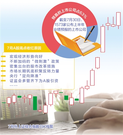 可以说,宏观经济形势向好直接固化了7月的红盘,其含金量最明显地体现在上市公司已经拉开的中报行情中。据Wind数据,截至7月30日,已经有1573家上市公司明确公布了上半年业绩预报,其中报喜的上市公司占比63%,也就是说有超过六成的上市公司承受住了今年经济下行的压力,取得了良好业绩。股市的上行动力已赫然在目。